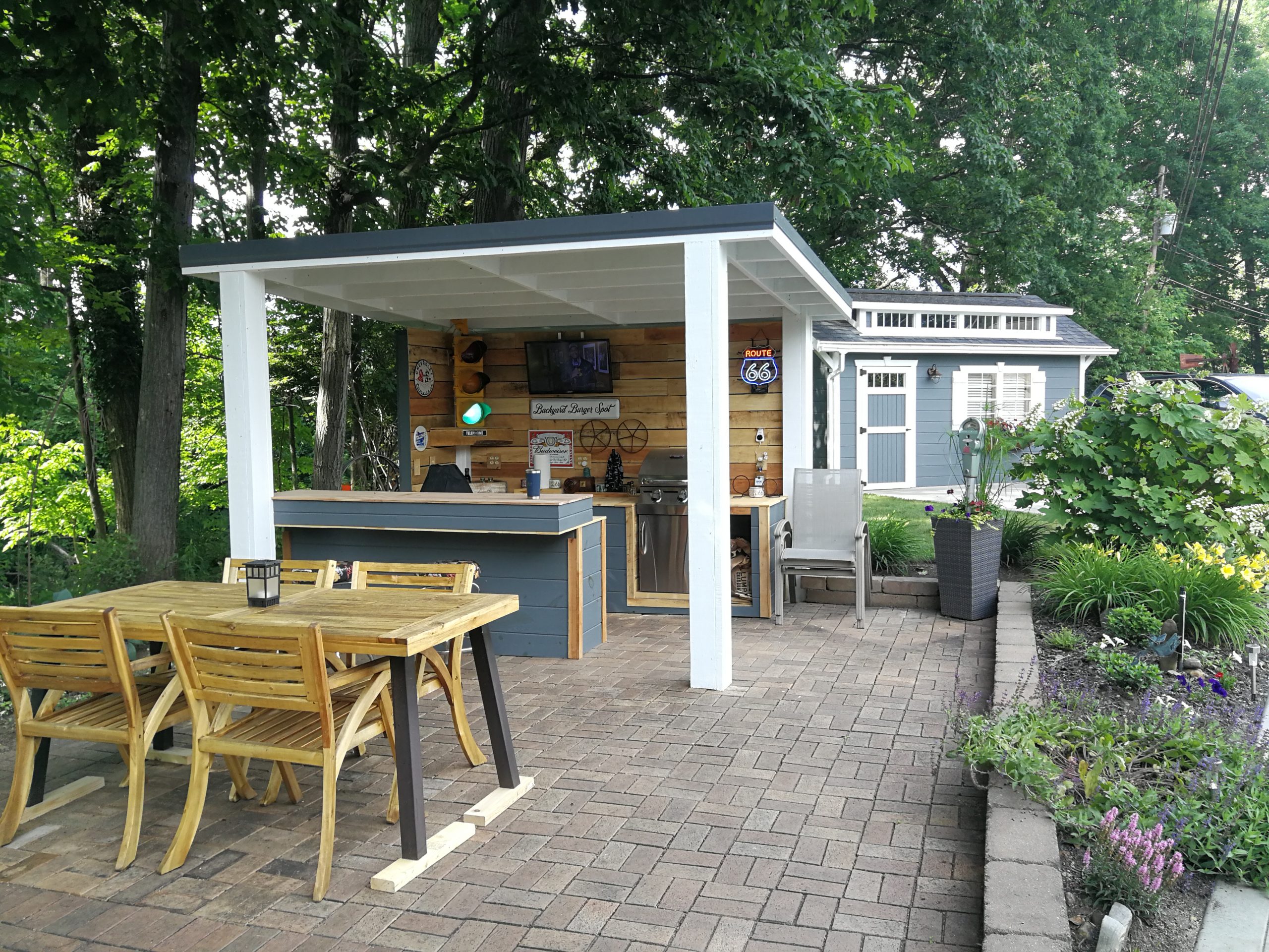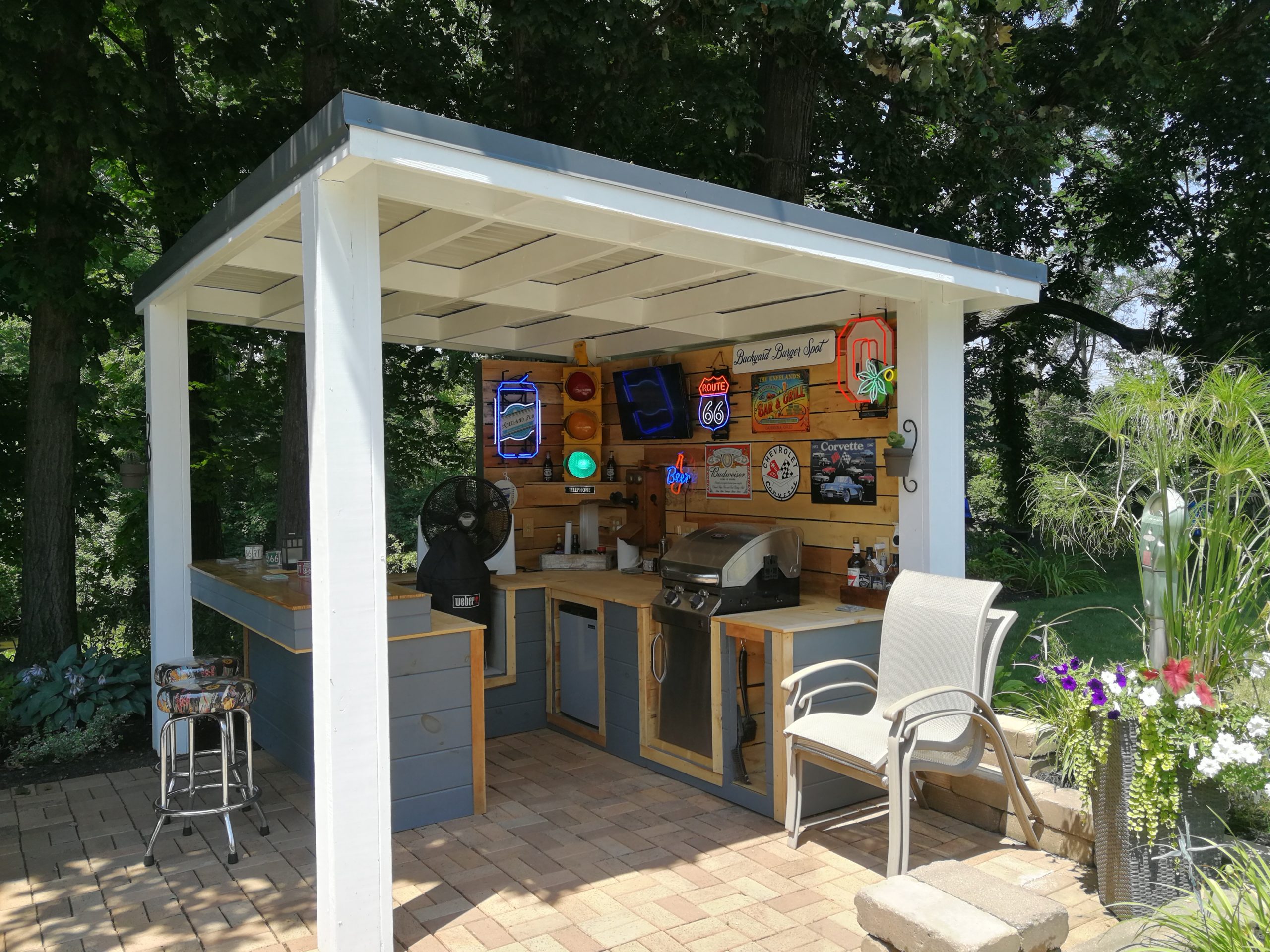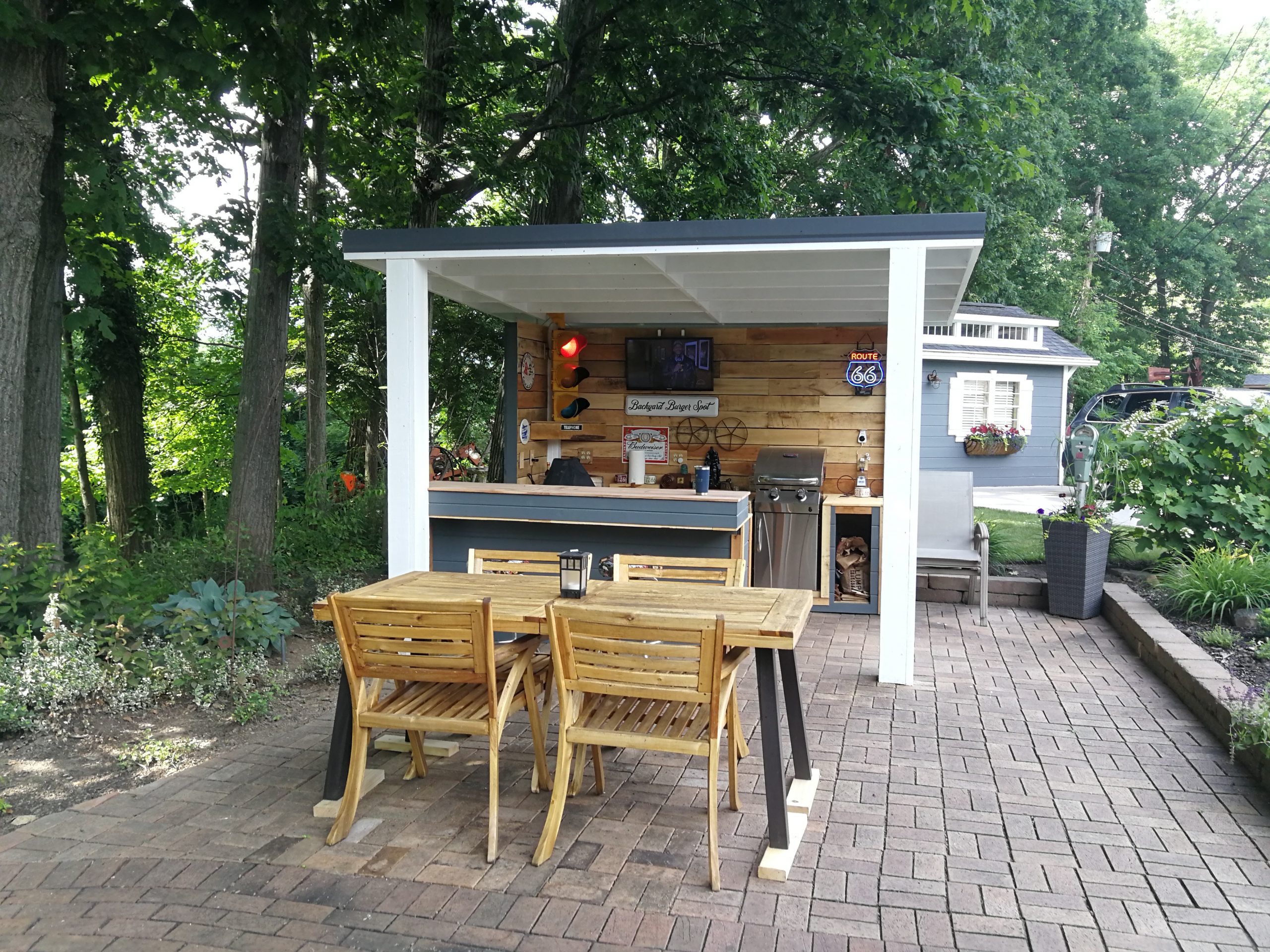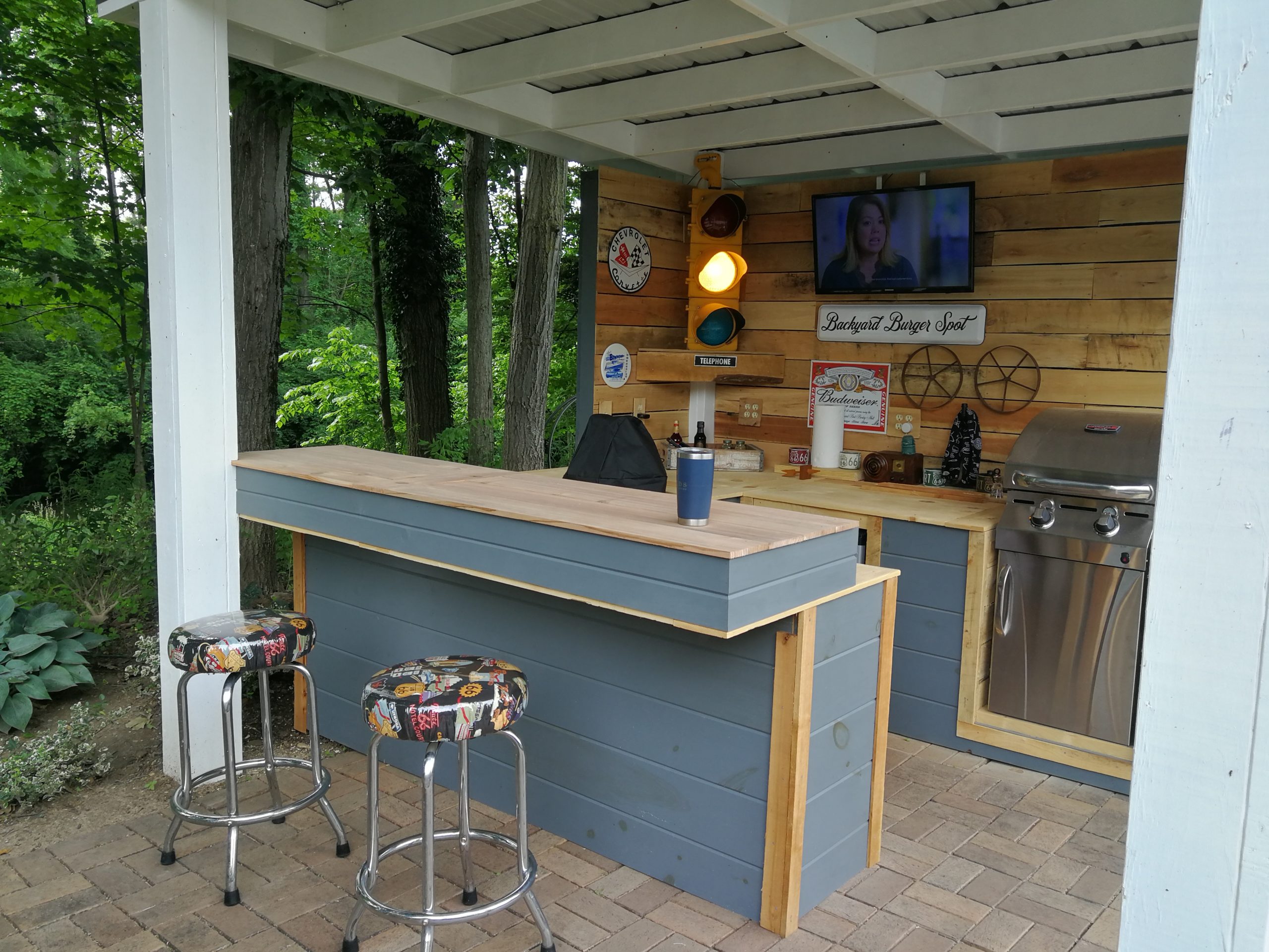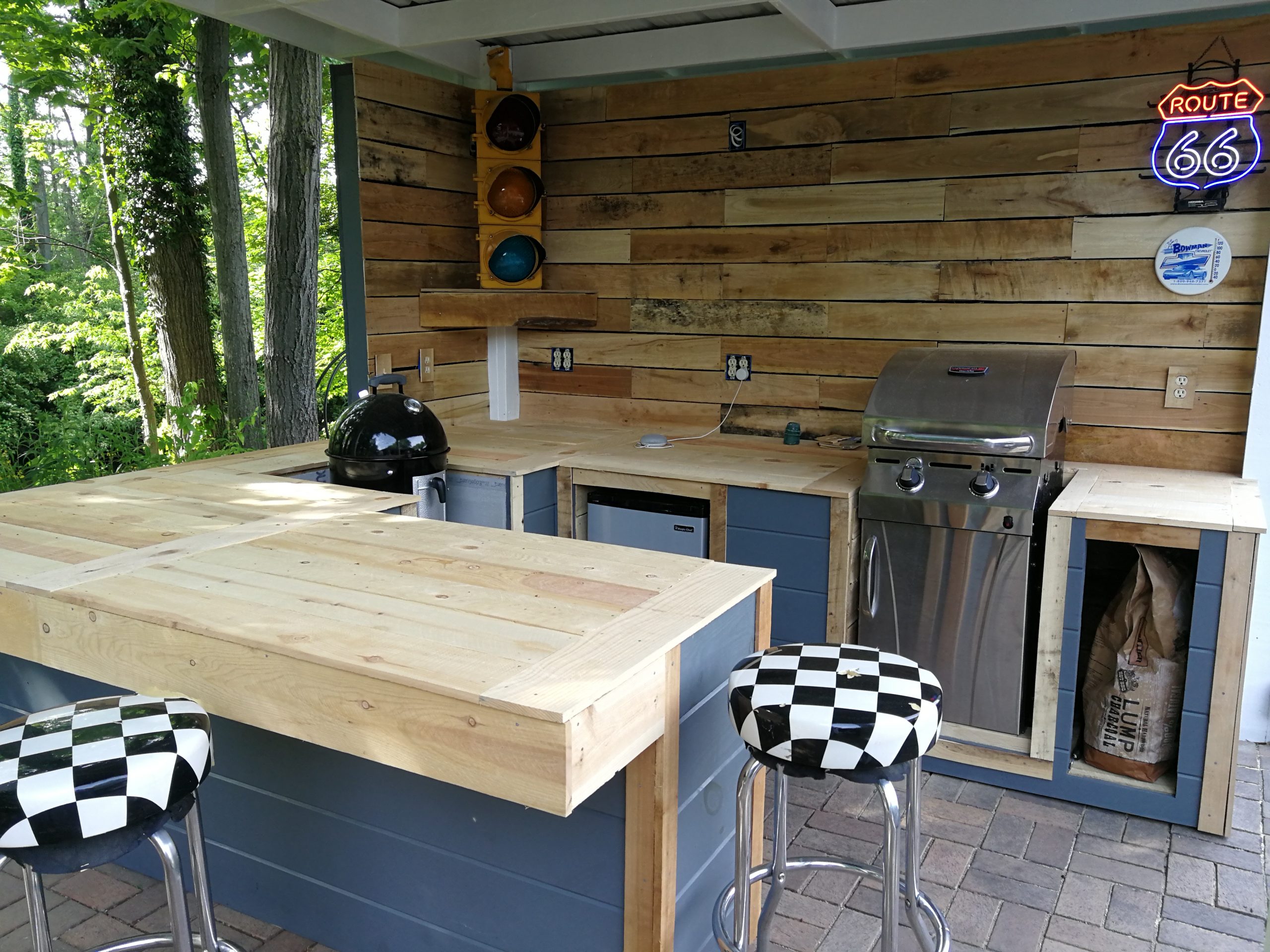 To make better use of the space Tom and Becky decided to remove both the fire pit and water feature and added a free-standing cover that also included space for a built-in grill and smoker plus new cabinet space, a future custom concrete countertop and some Route 66 and Corvette bling. The area uses pallet wood for the back wall covering and tongue and groove horizontal pine siding for the counter and cabinet face surfaces. The side and back outside walls also use the same horizontal, tongue-and-groove double 4 wood siding and is painted to match our surrounding buildings, and the countertop is currently 6″ dog-eared cedar fence panels.