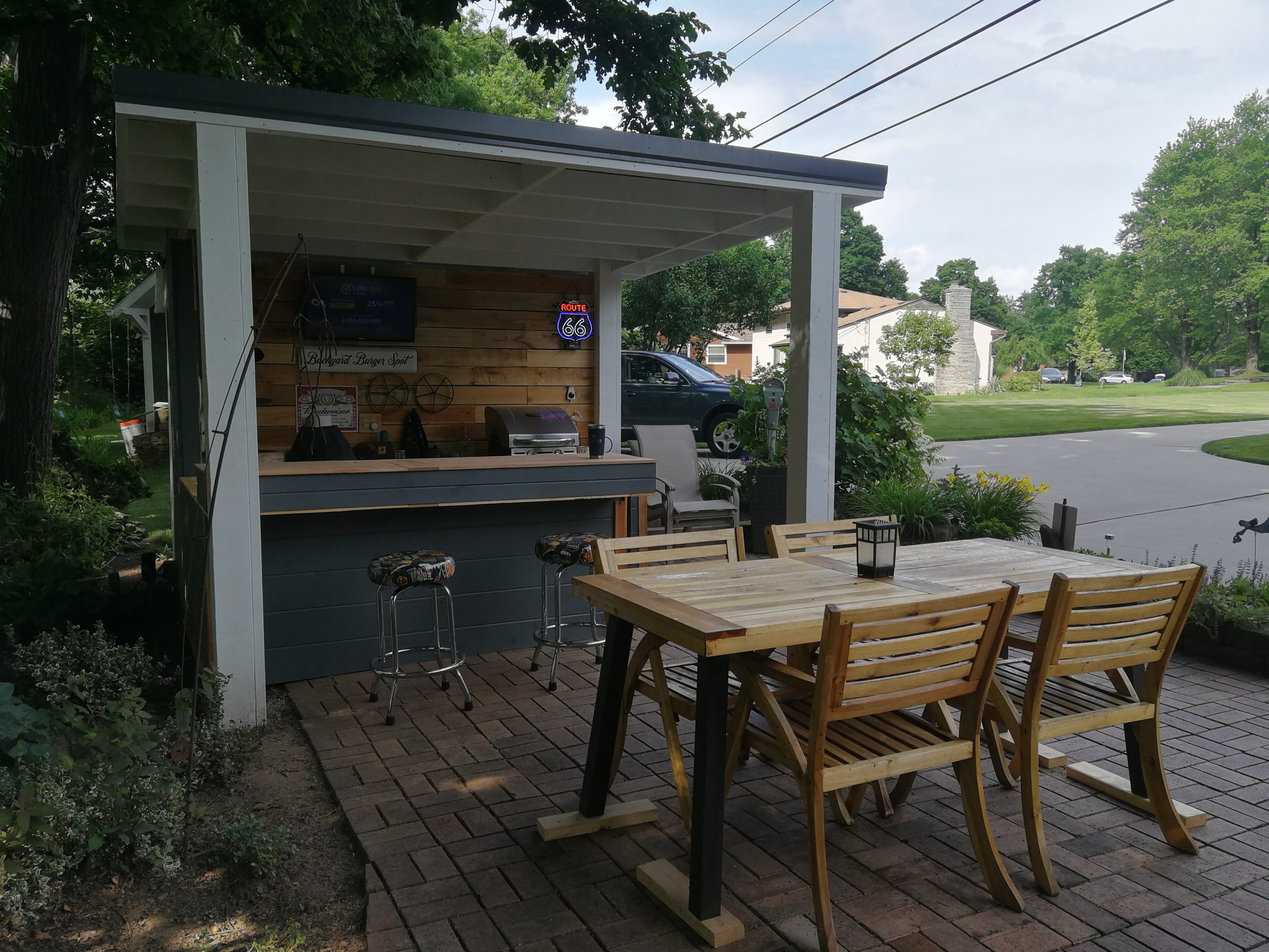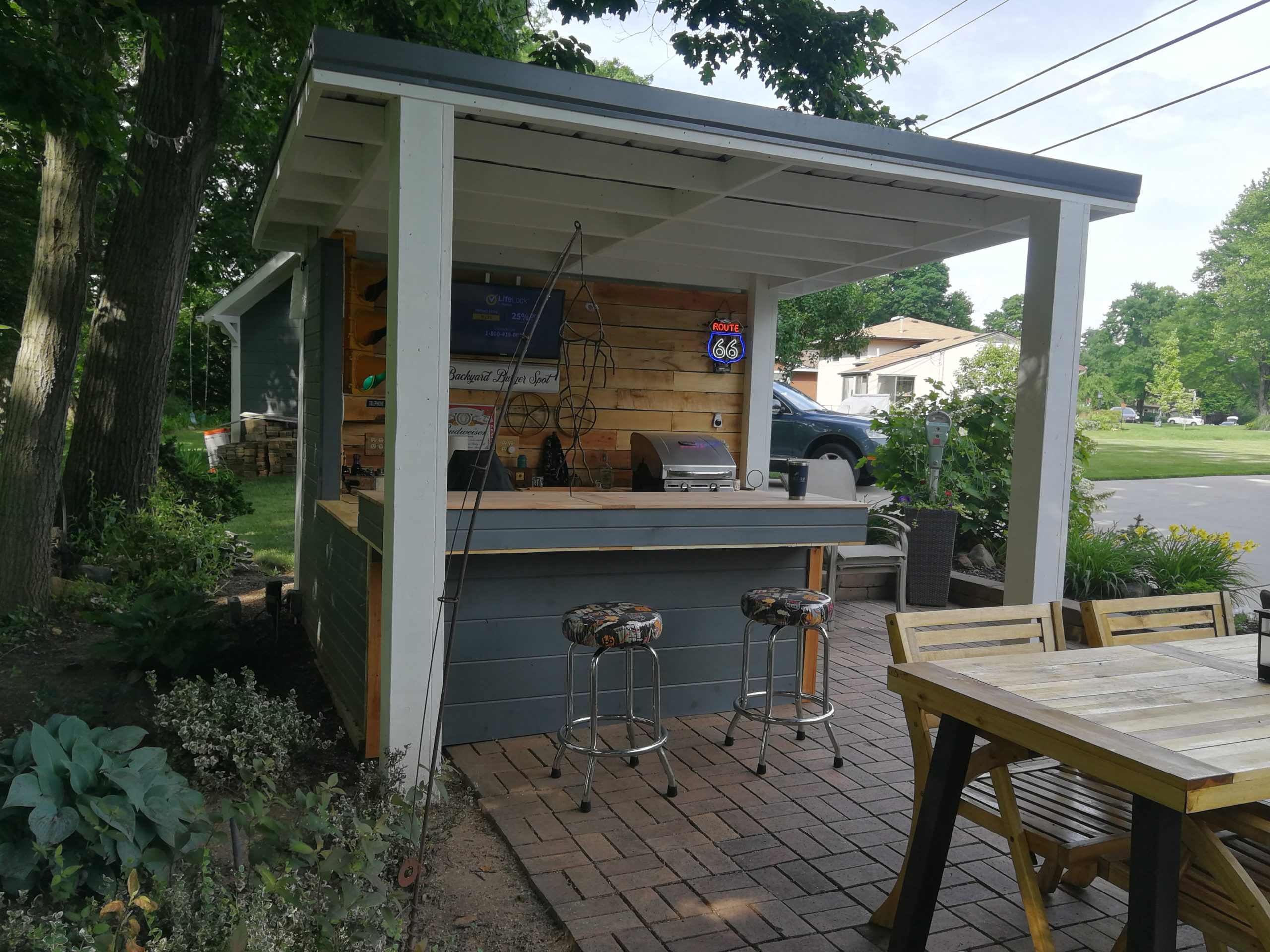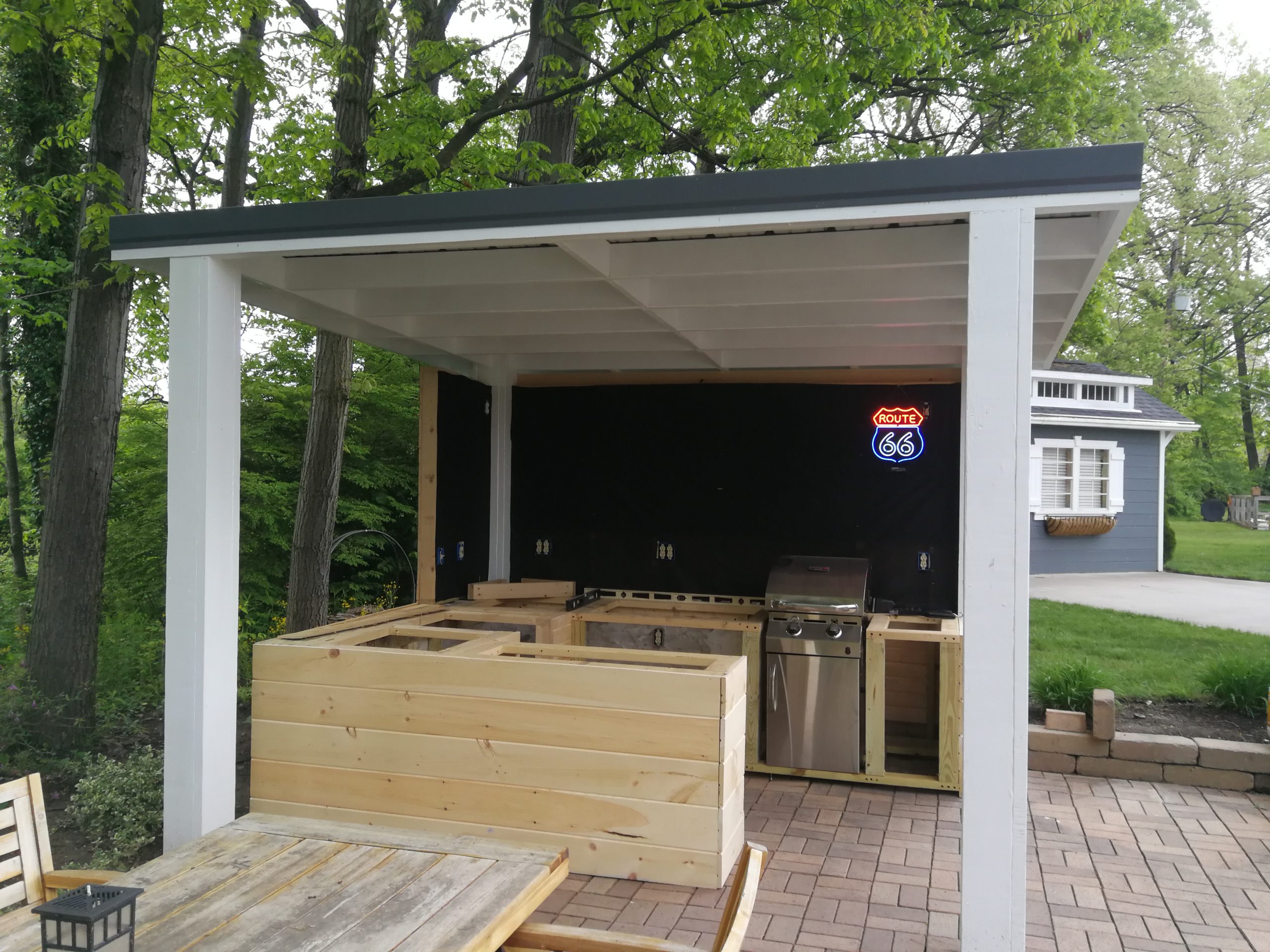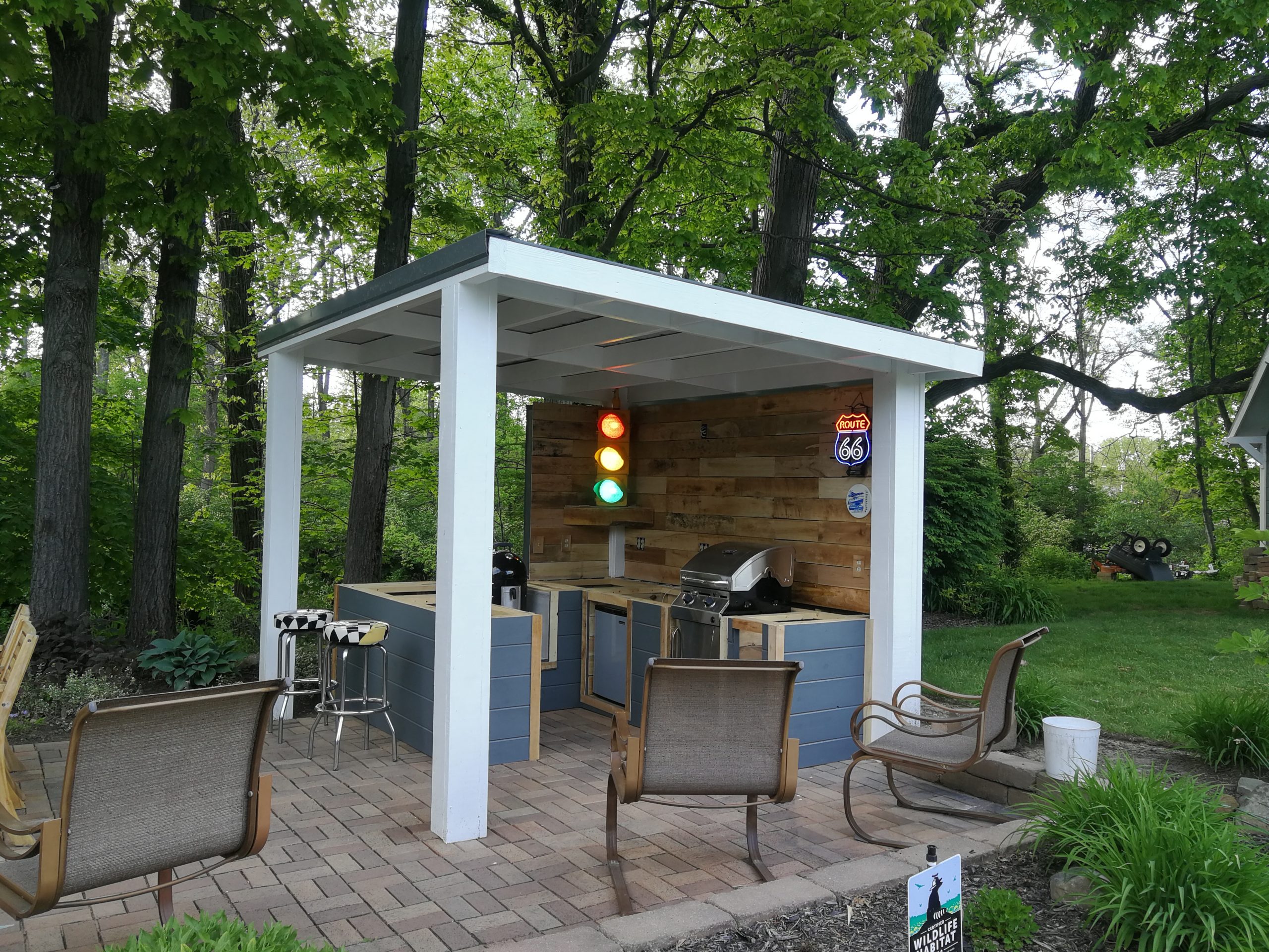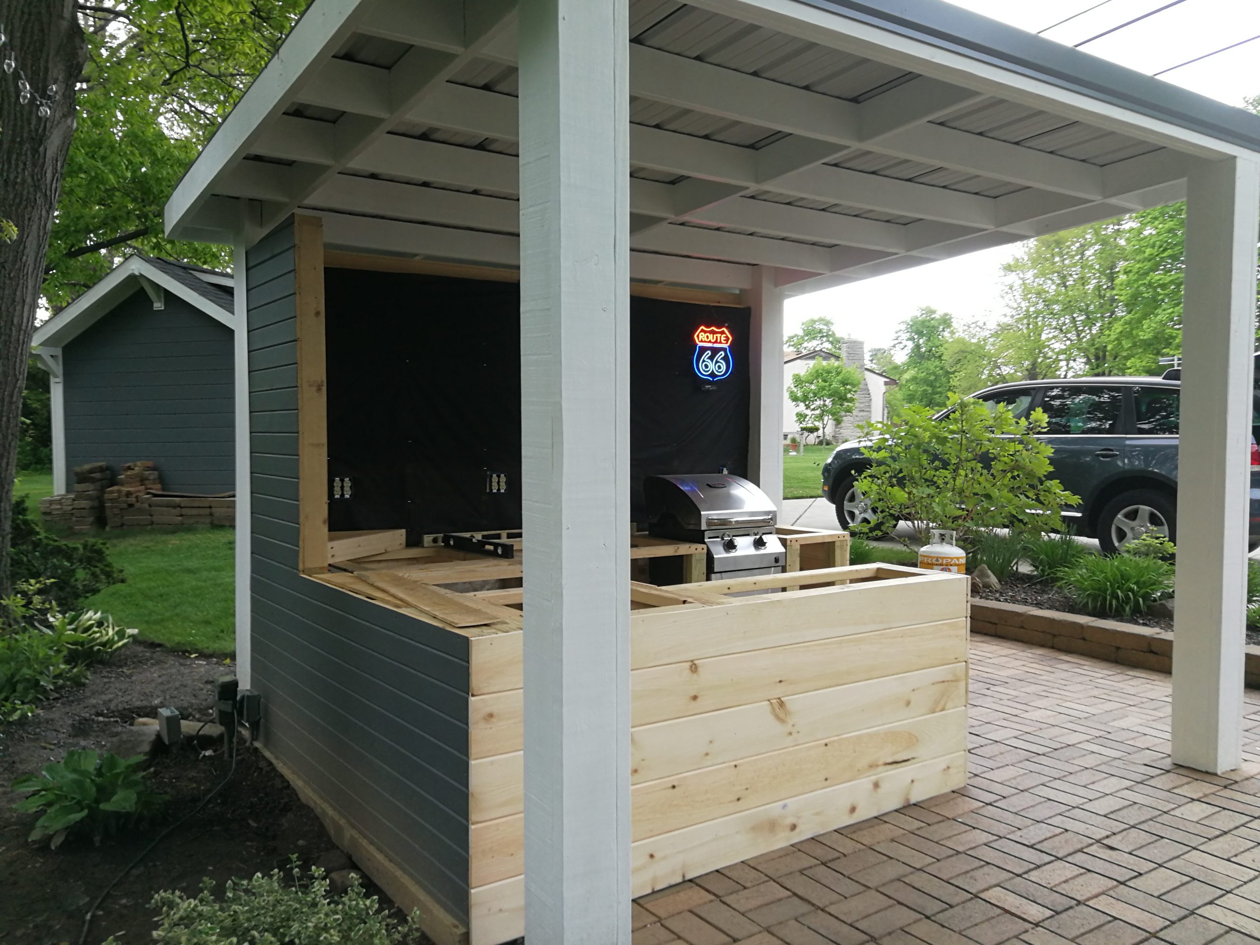 To make better use of the space Tom and Becky decided to remove both the fire pit and water feature and added a free-standing cover that also included space for a built-in grill and smoker plus new cabinet space, a future custom concrete countertop and some Route 66 and Corvette bling. The area uses pallet wood for the back wall covering and tongue and groove horizontal pine siding for the counter and cabinet face surfaces. The side and back outside walls also use the same horizontal, tongue-and-groove double 4 wood siding and is painted to match our surrounding buildings, and the countertop is currently 6″ dog-eared cedar fence panels.