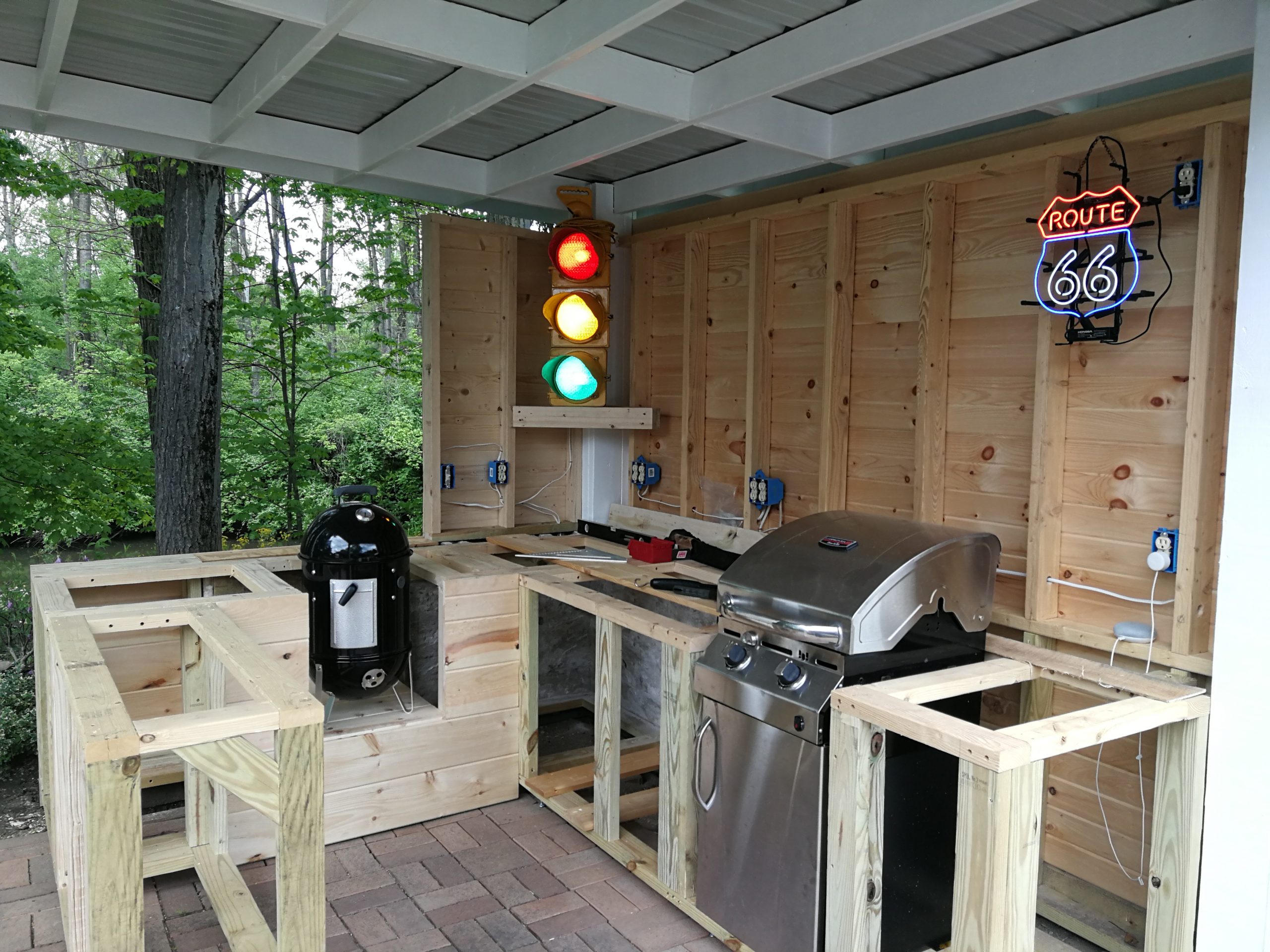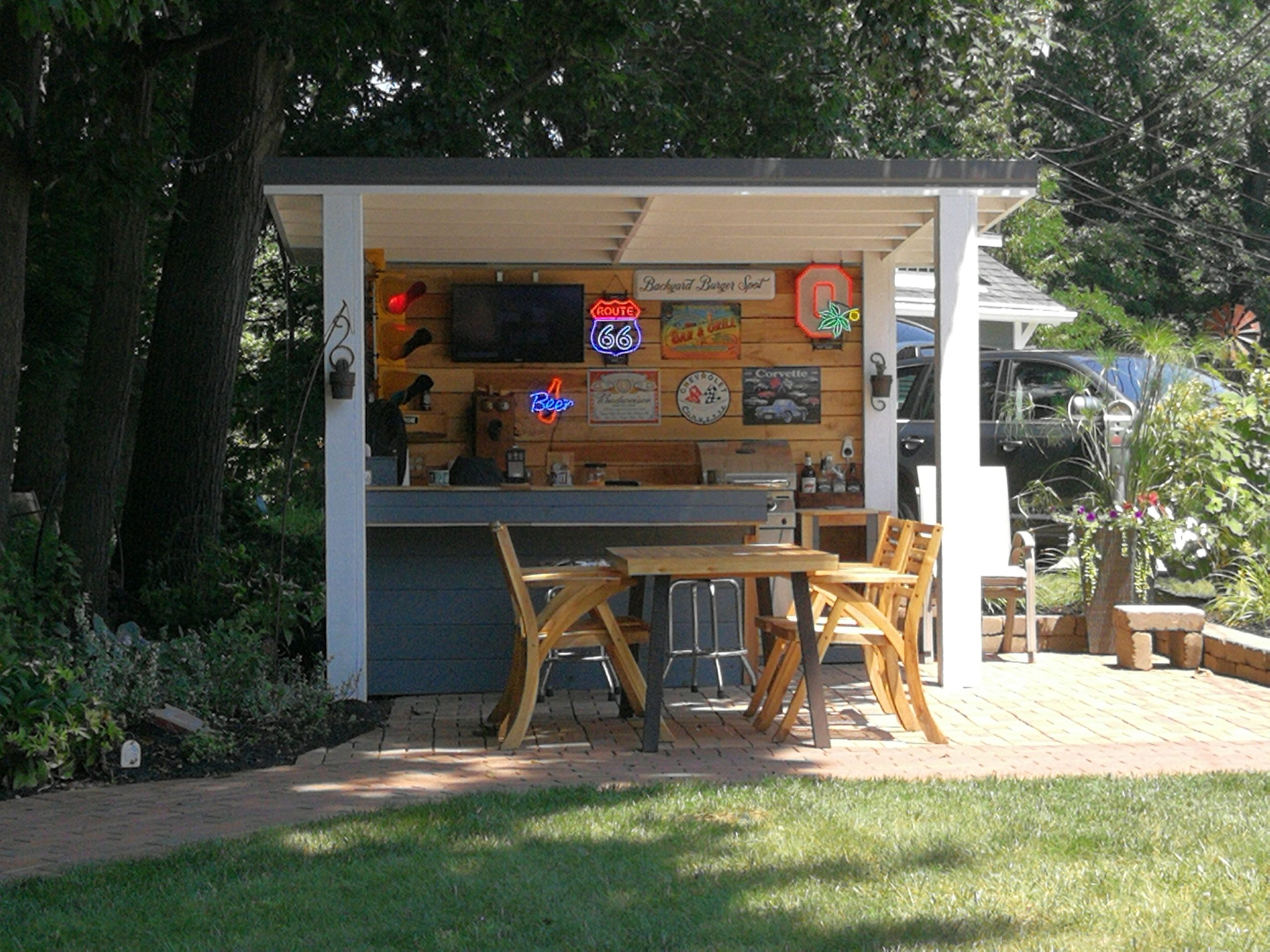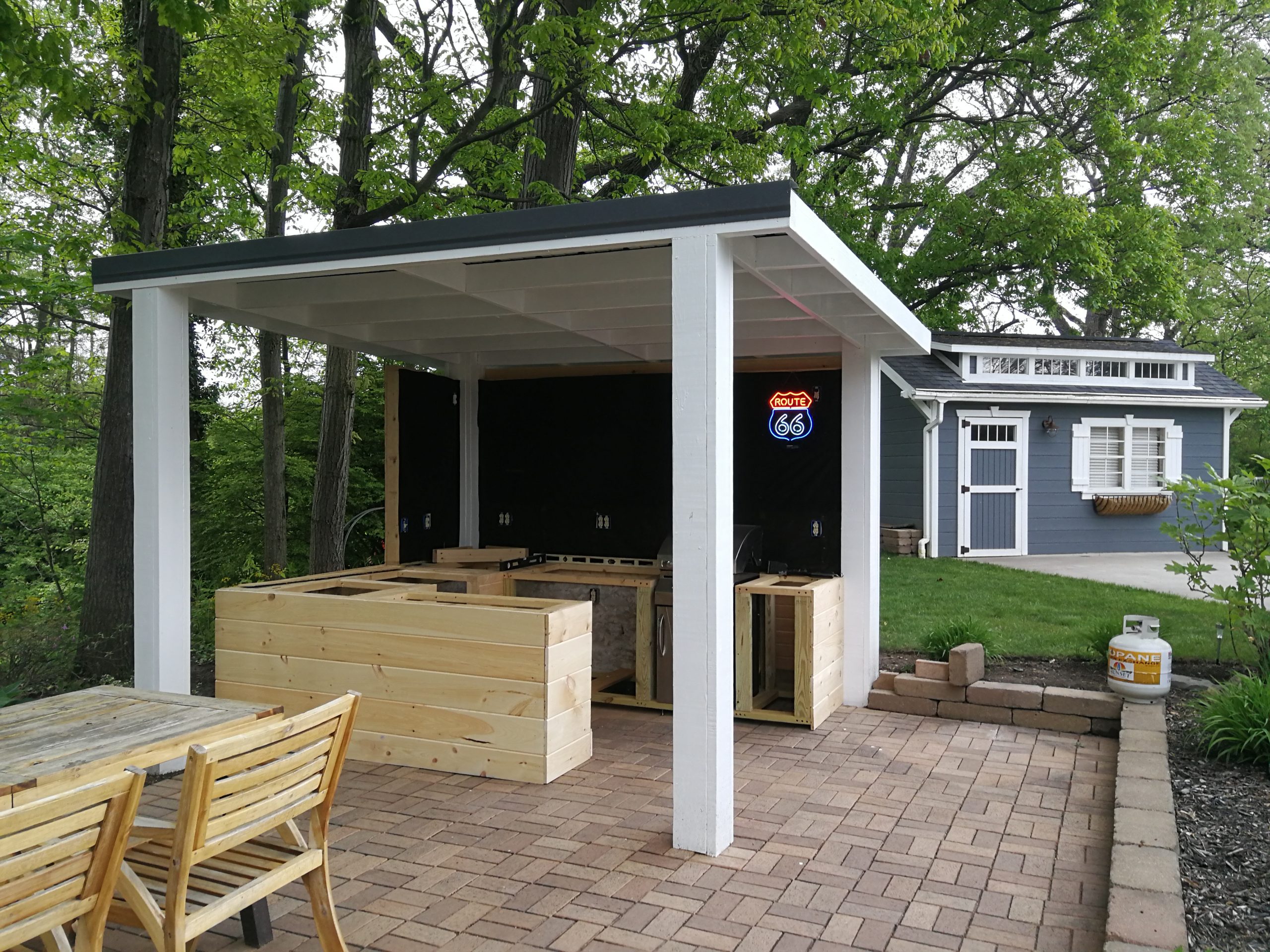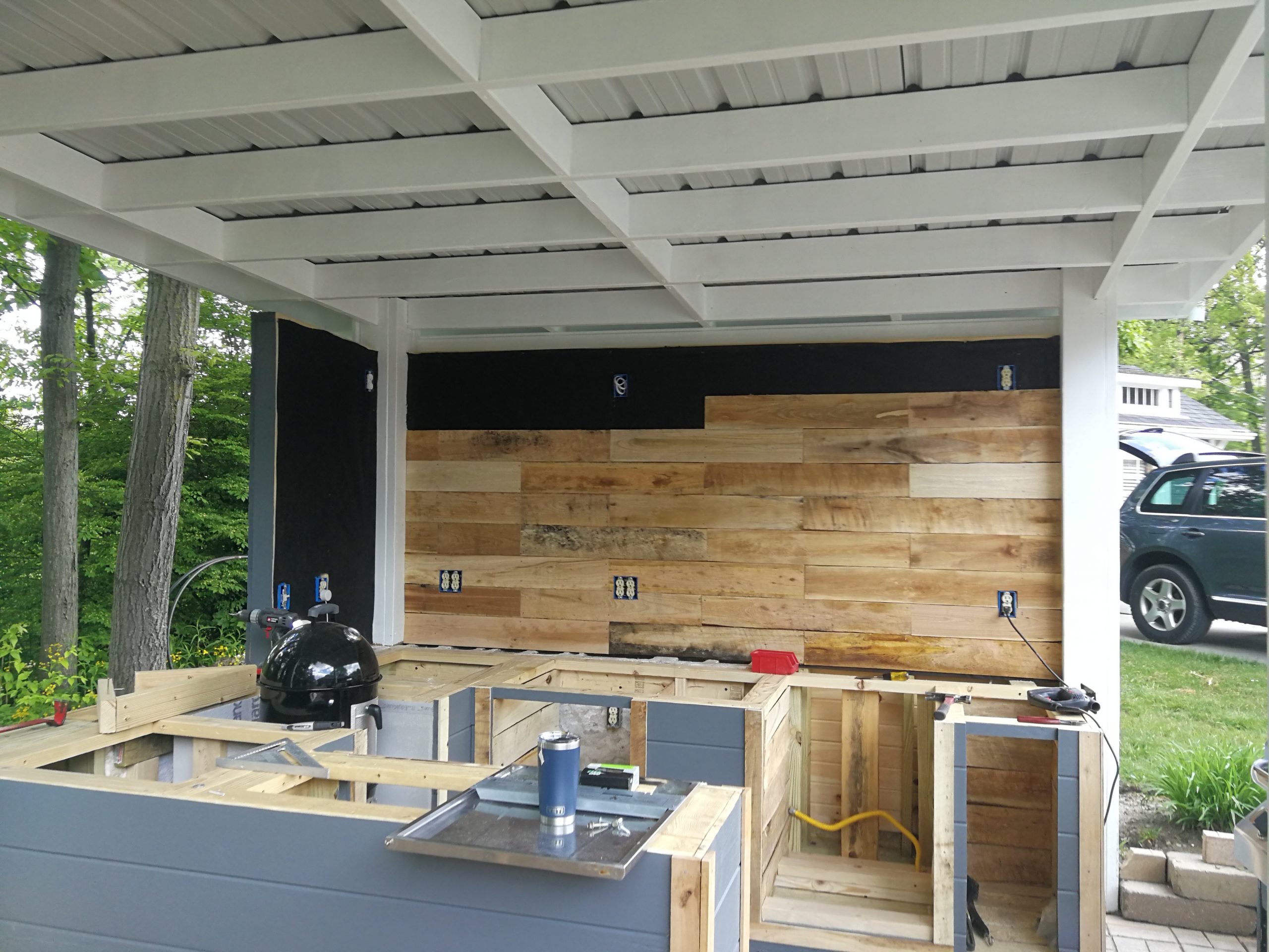 To make better use of the space Tom and Becky decided to remove both the fire pit and water feature and added a free-standing cover that also included space for a built-in grill and smoker plus new cabinet space, a future custom concrete countertop and some Route 66 and Corvette bling. The area uses pallet wood for the back wall covering and tongue and groove horizontal pine siding for the counter and cabinet face surfaces. The side and back outside walls also use the same horizontal, tongue-and-groove double 4 wood siding and is painted to match our surrounding buildings, and the countertop is currently 6″ dog-eared cedar fence panels.