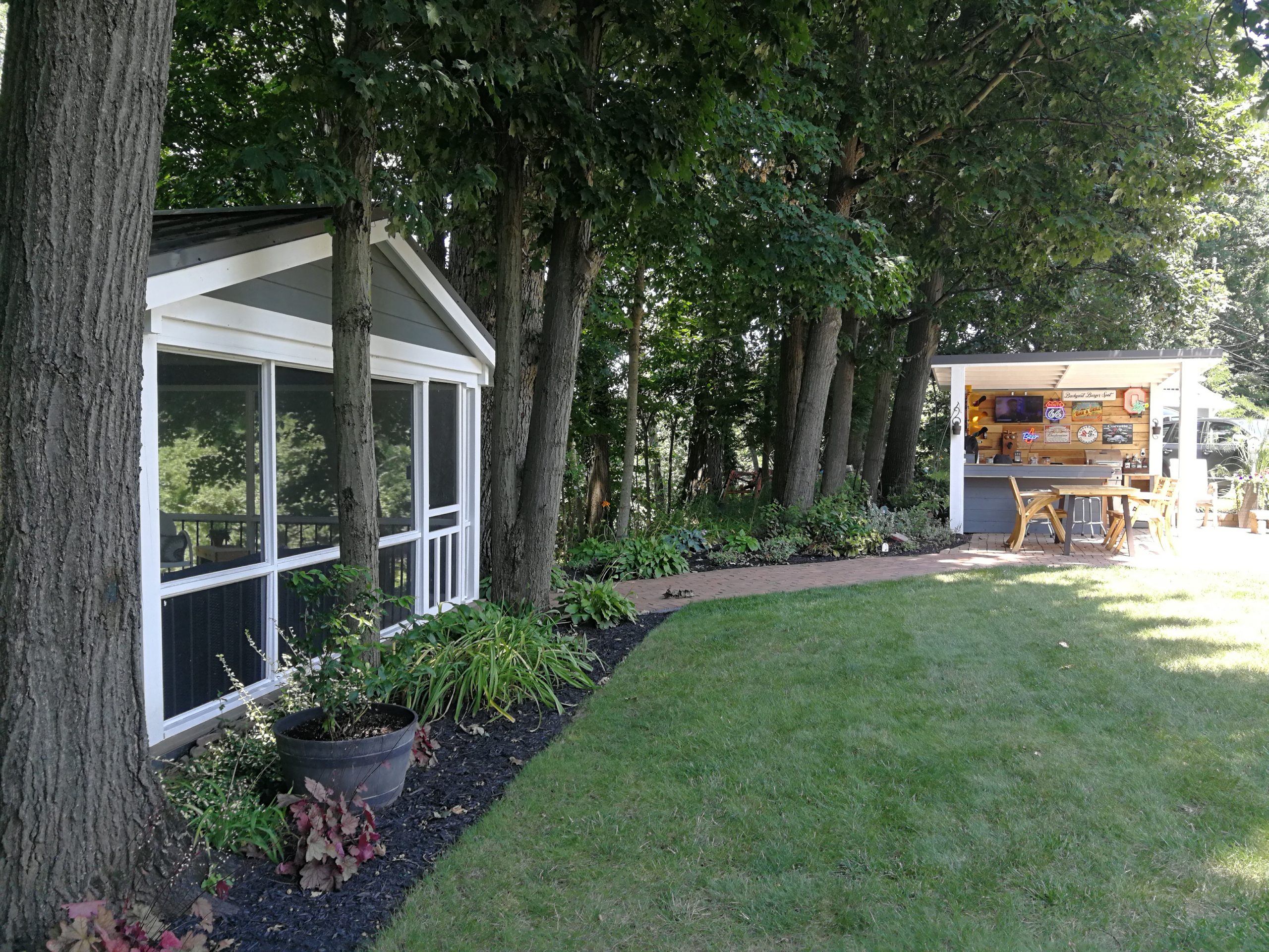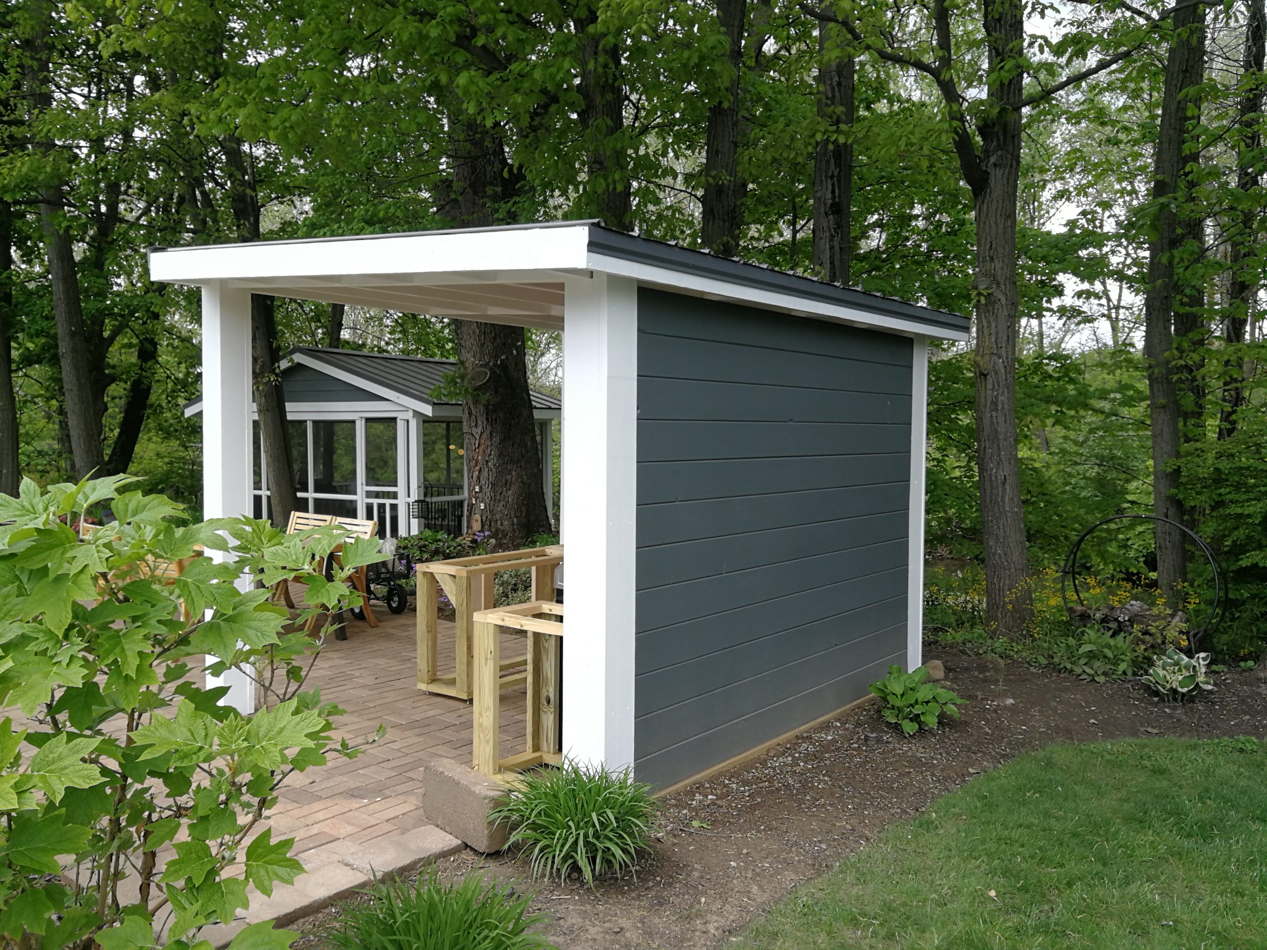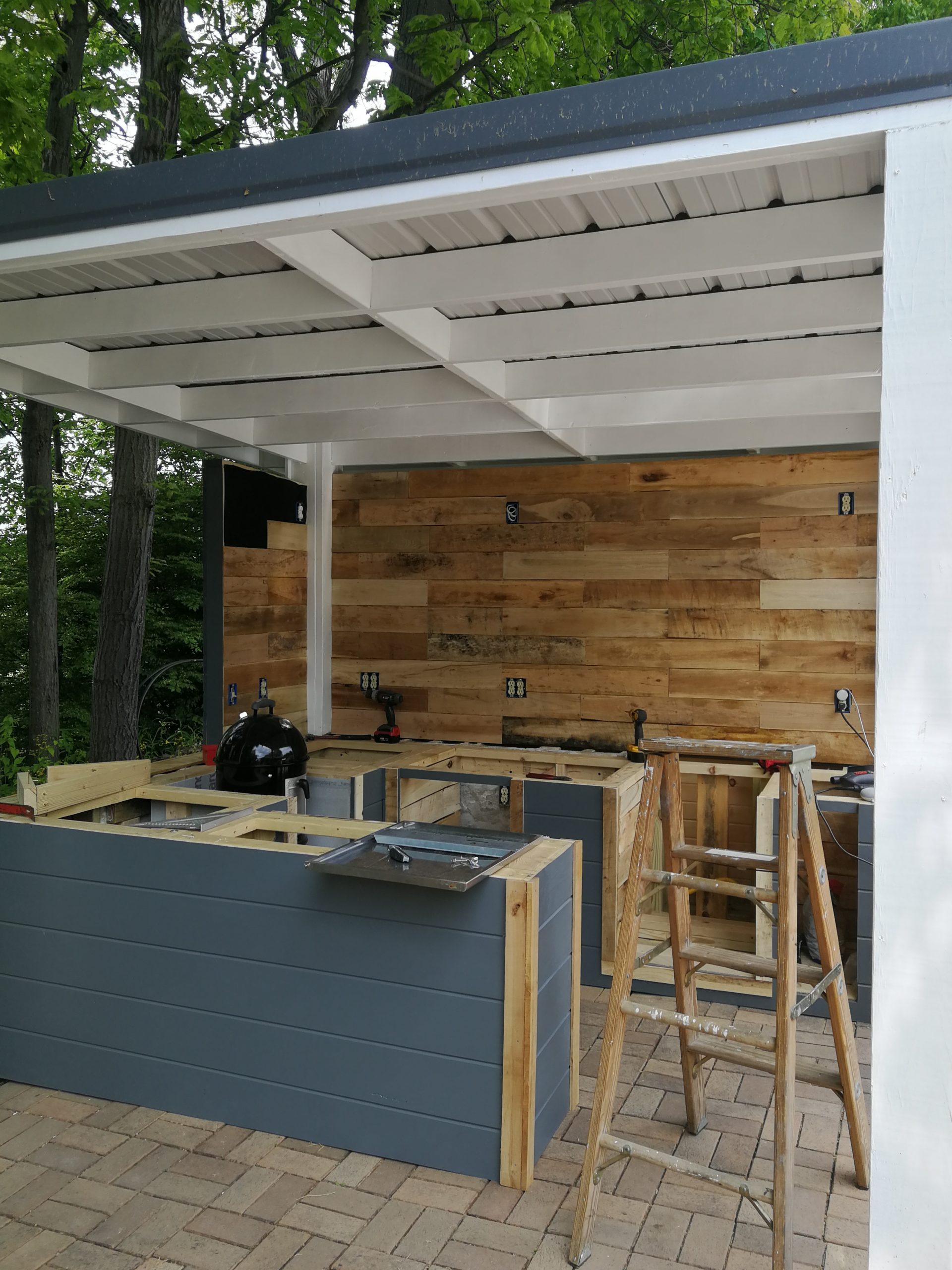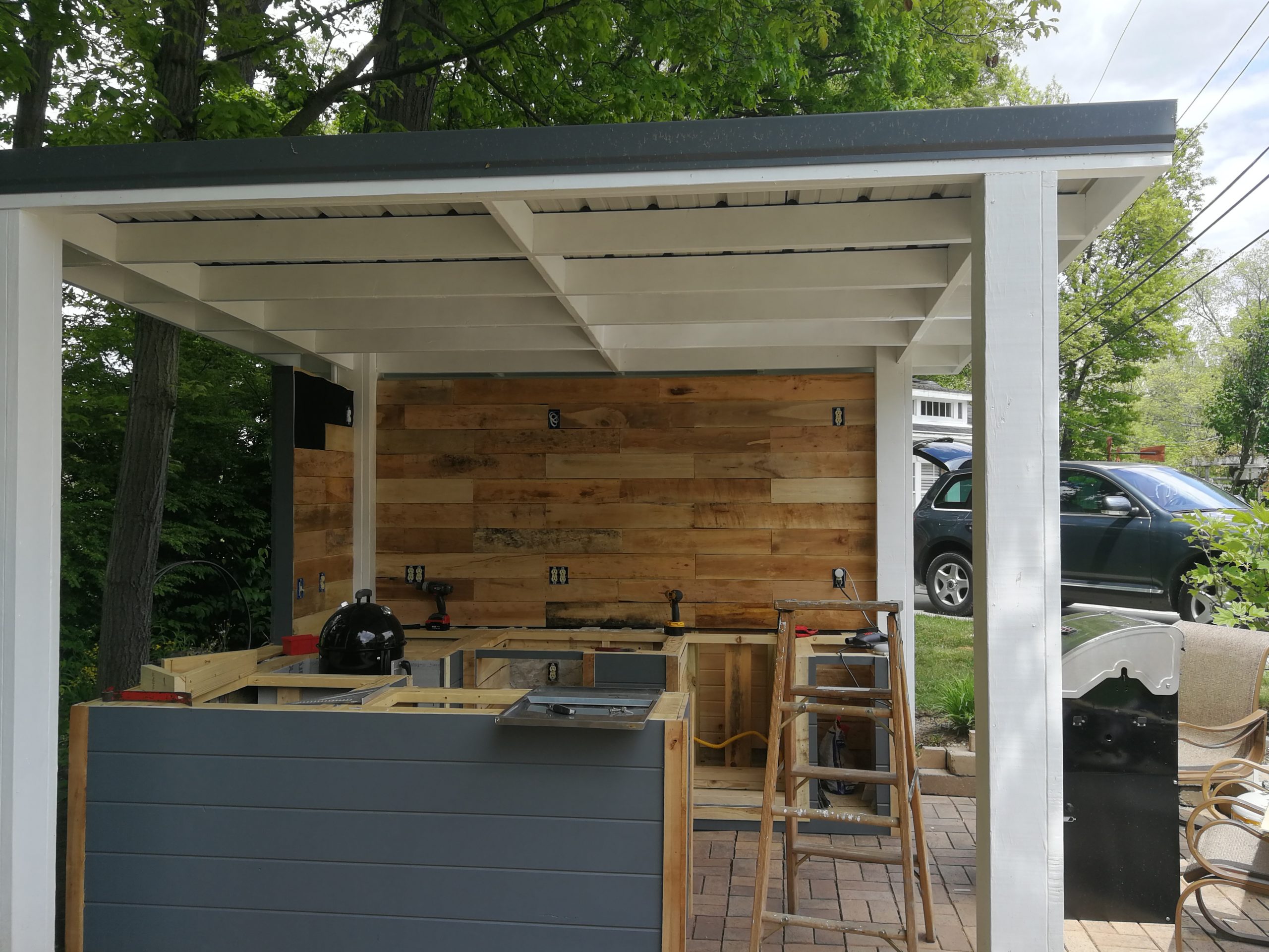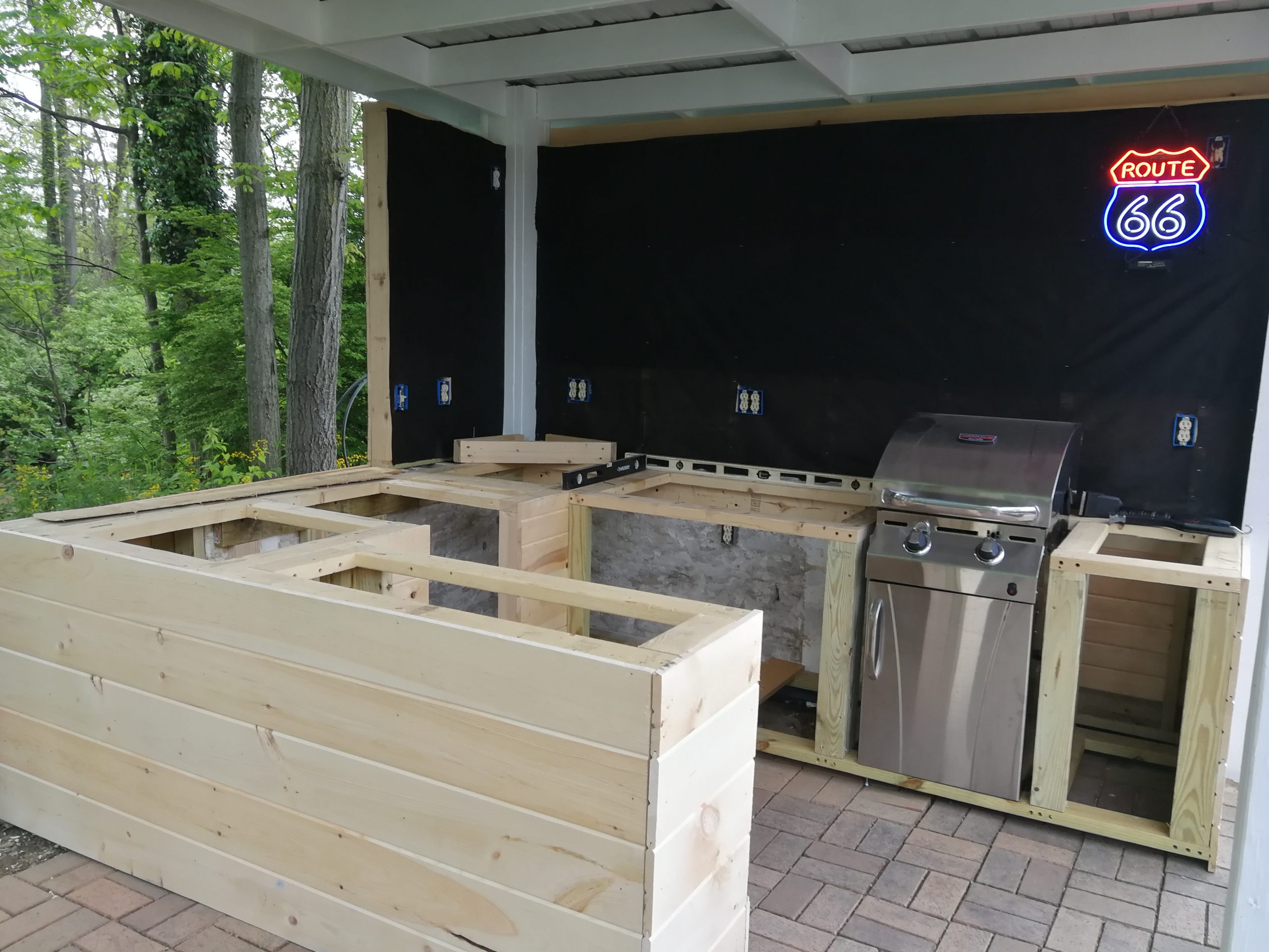 To make better use of the space Tom and Becky decided to remove both the fire pit and water feature and added a free-standing cover that also included space for a built-in grill and smoker plus new cabinet space, a future custom concrete countertop and some Route 66 and Corvette bling. The area uses pallet wood for the back wall covering and tongue and groove horizontal pine siding for the counter and cabinet face surfaces. The side and back outside walls also use the same horizontal, tongue-and-groove double 4 wood siding and is painted to match our surrounding buildings, and the countertop is currently 6″ dog-eared cedar fence panels.