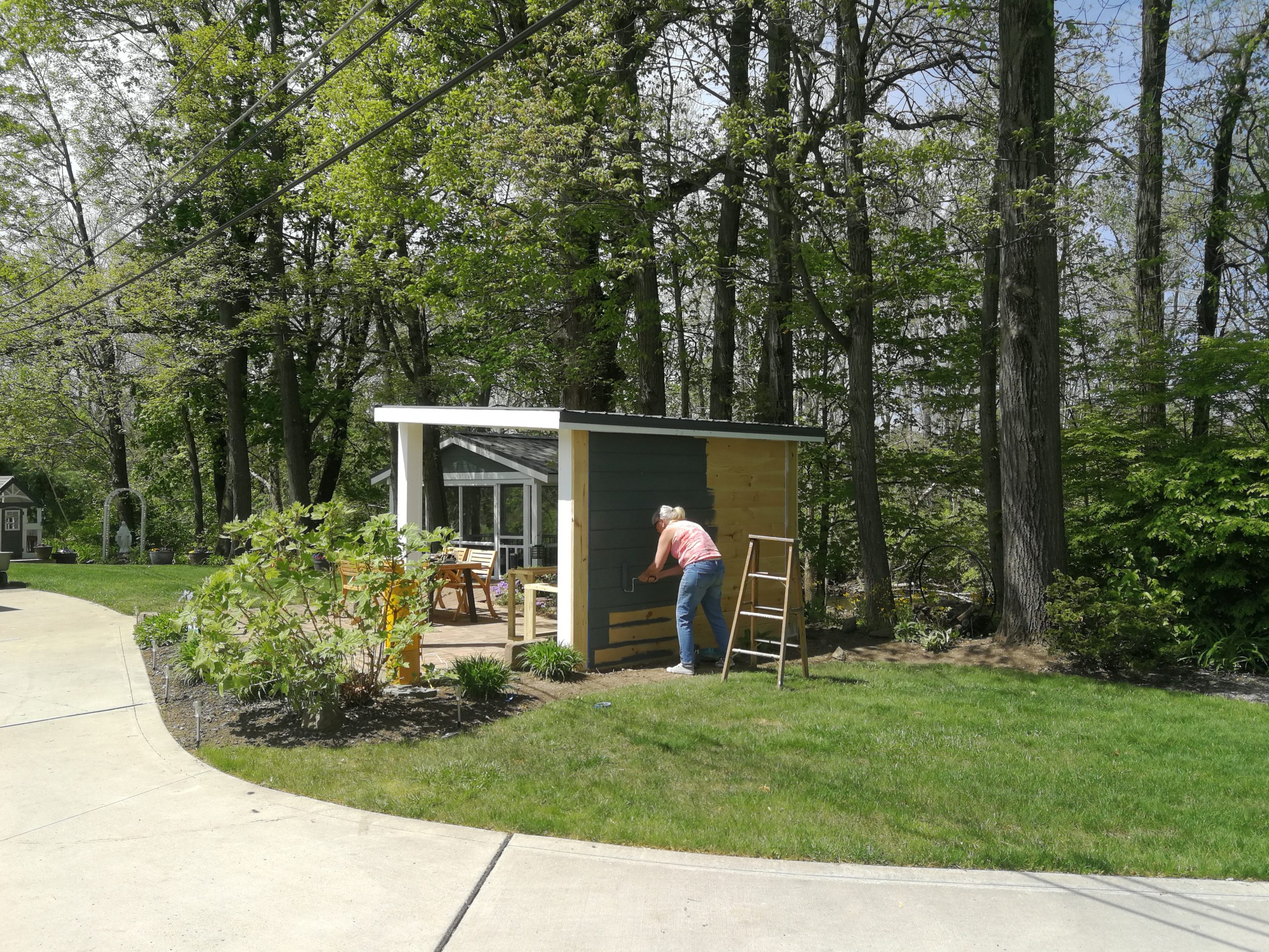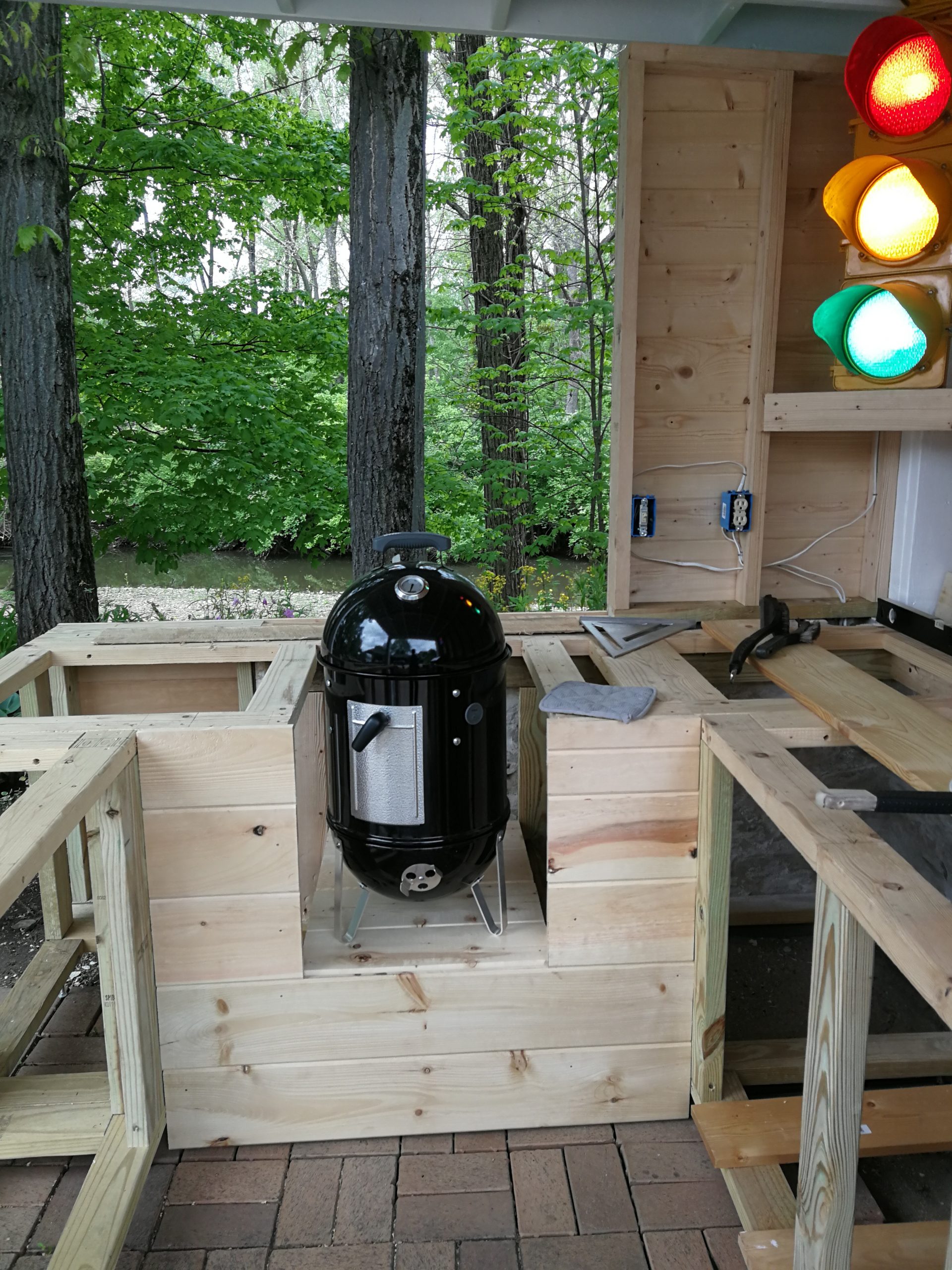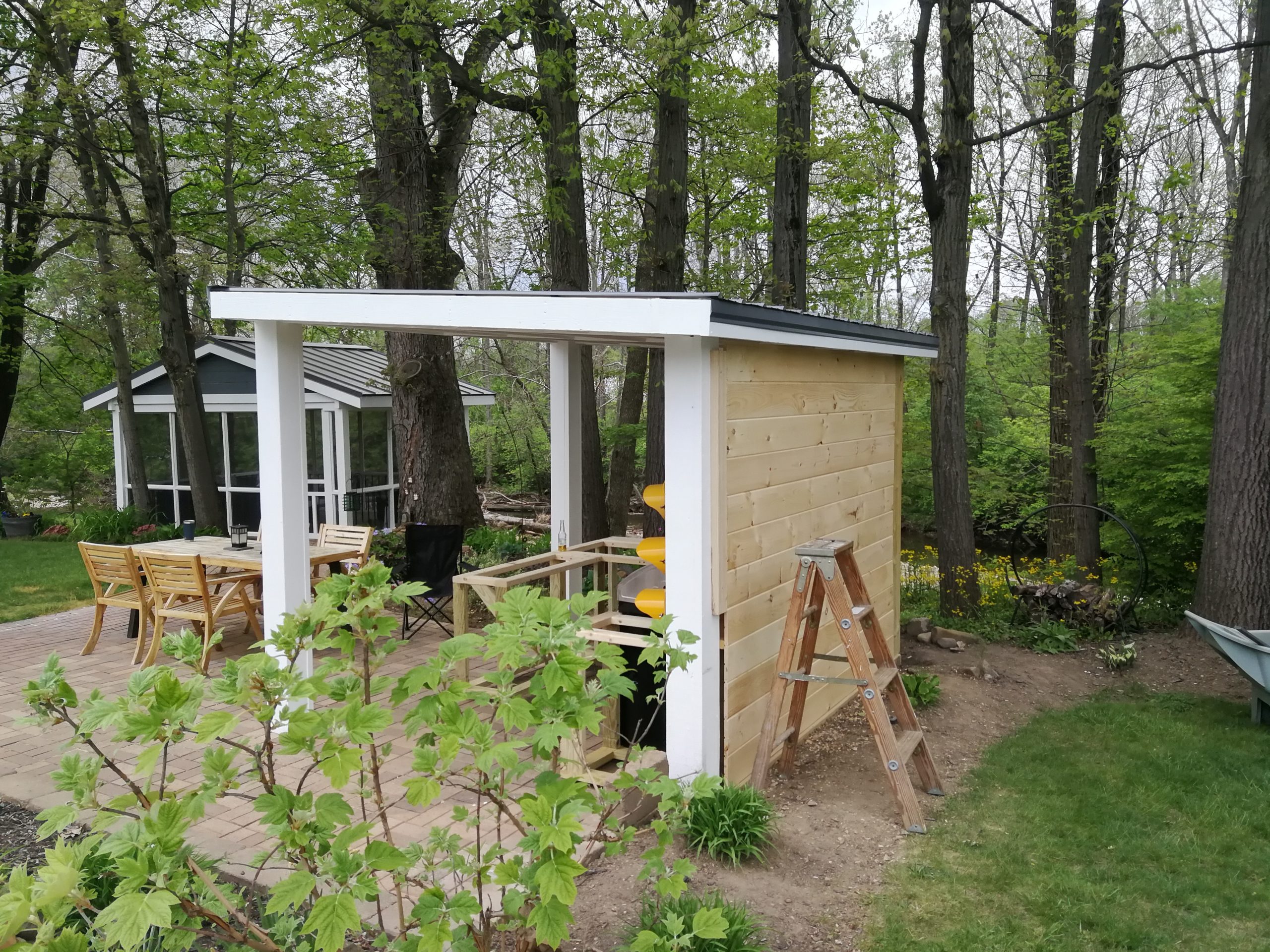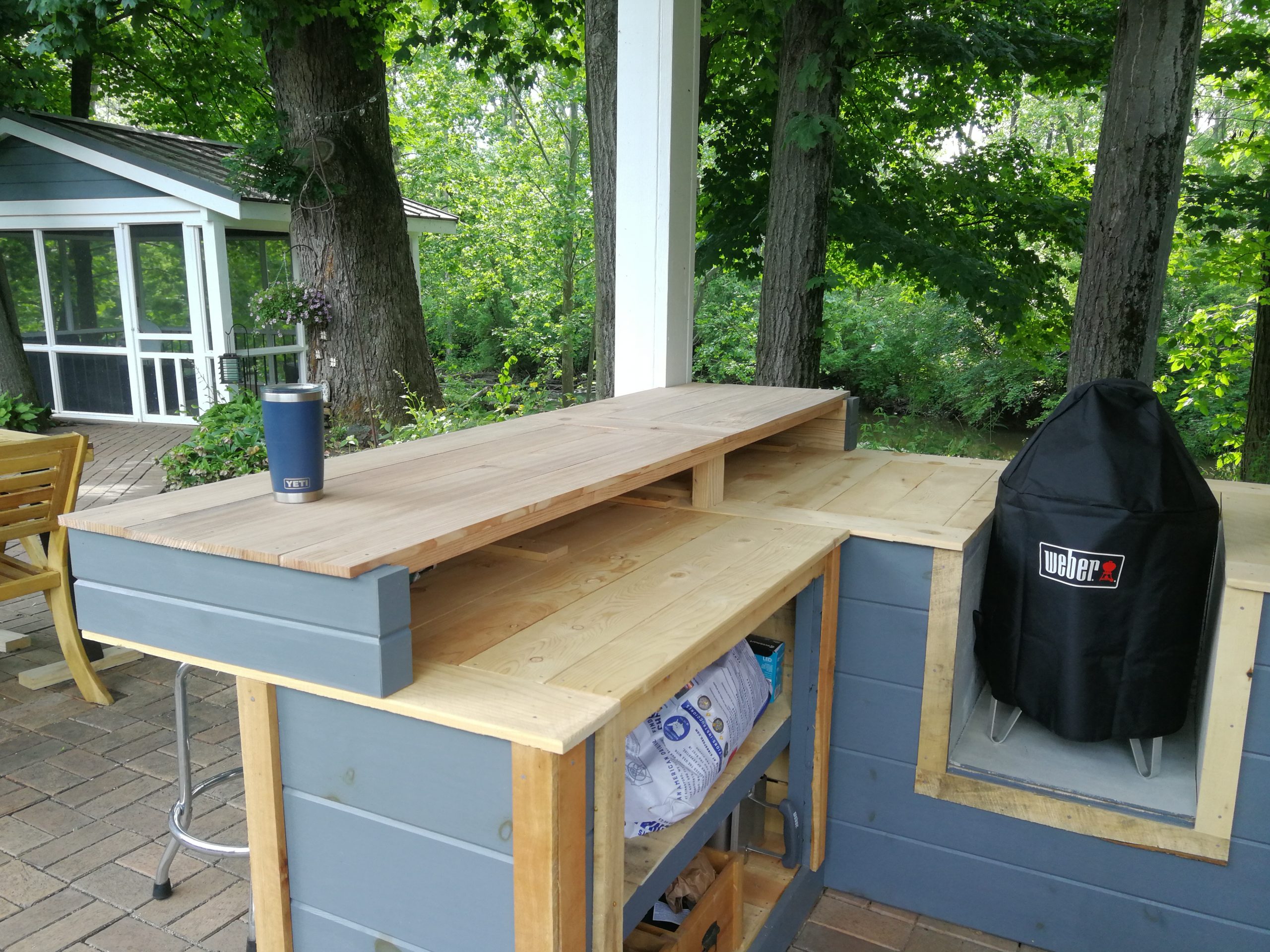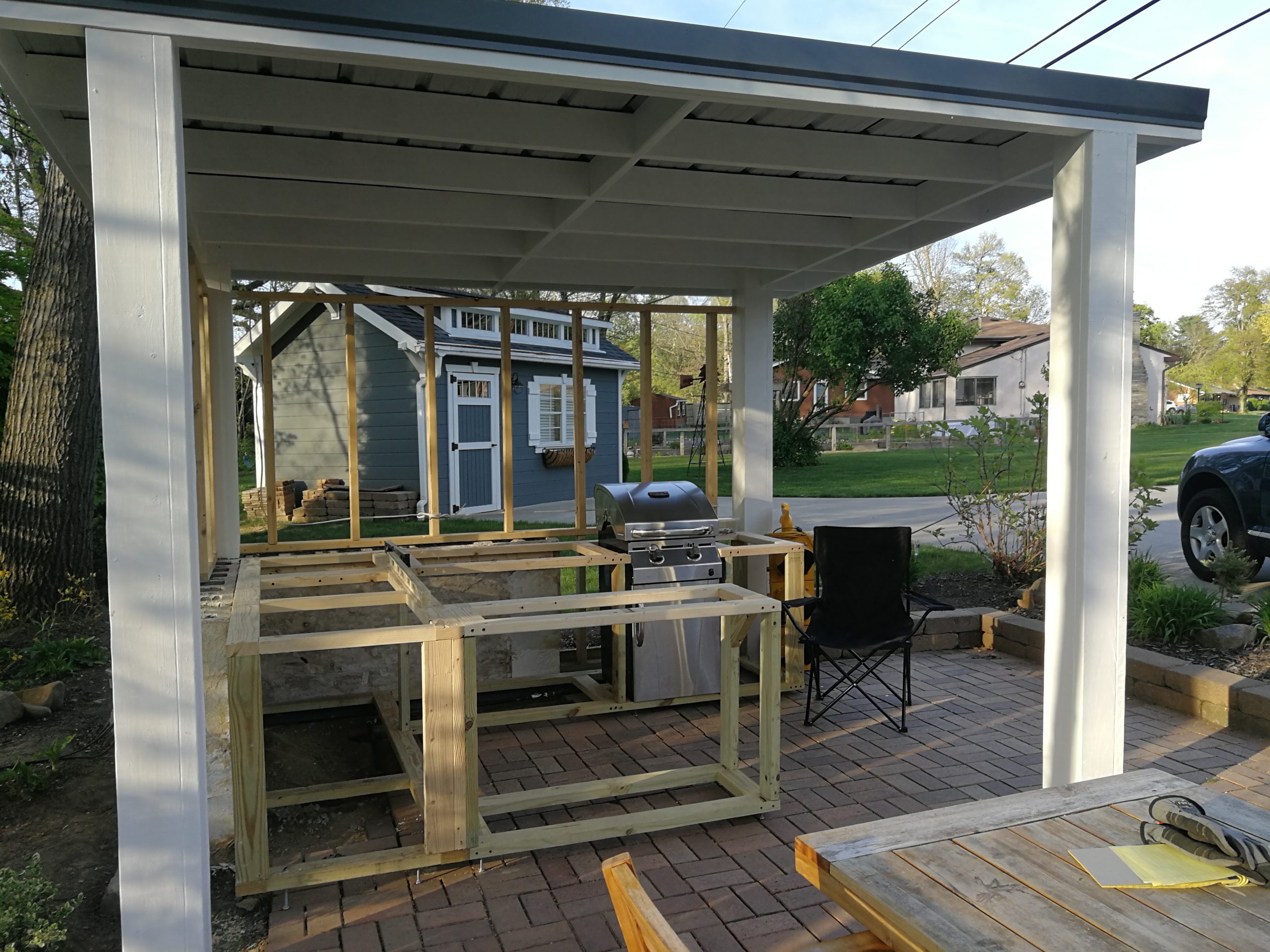 To make better use of the space Tom and Becky decided to remove both the fire pit and water feature and added a free-standing cover that also included space for a built-in grill and smoker plus new cabinet space, a future custom concrete countertop and some Route 66 and Corvette bling. The area uses pallet wood for the back wall covering and tongue and groove horizontal pine siding for the counter and cabinet face surfaces. The side and back outside walls also use the same horizontal, tongue-and-groove double 4 wood siding and is painted to match our surrounding buildings, and the countertop is currently 6″ dog-eared cedar fence panels.