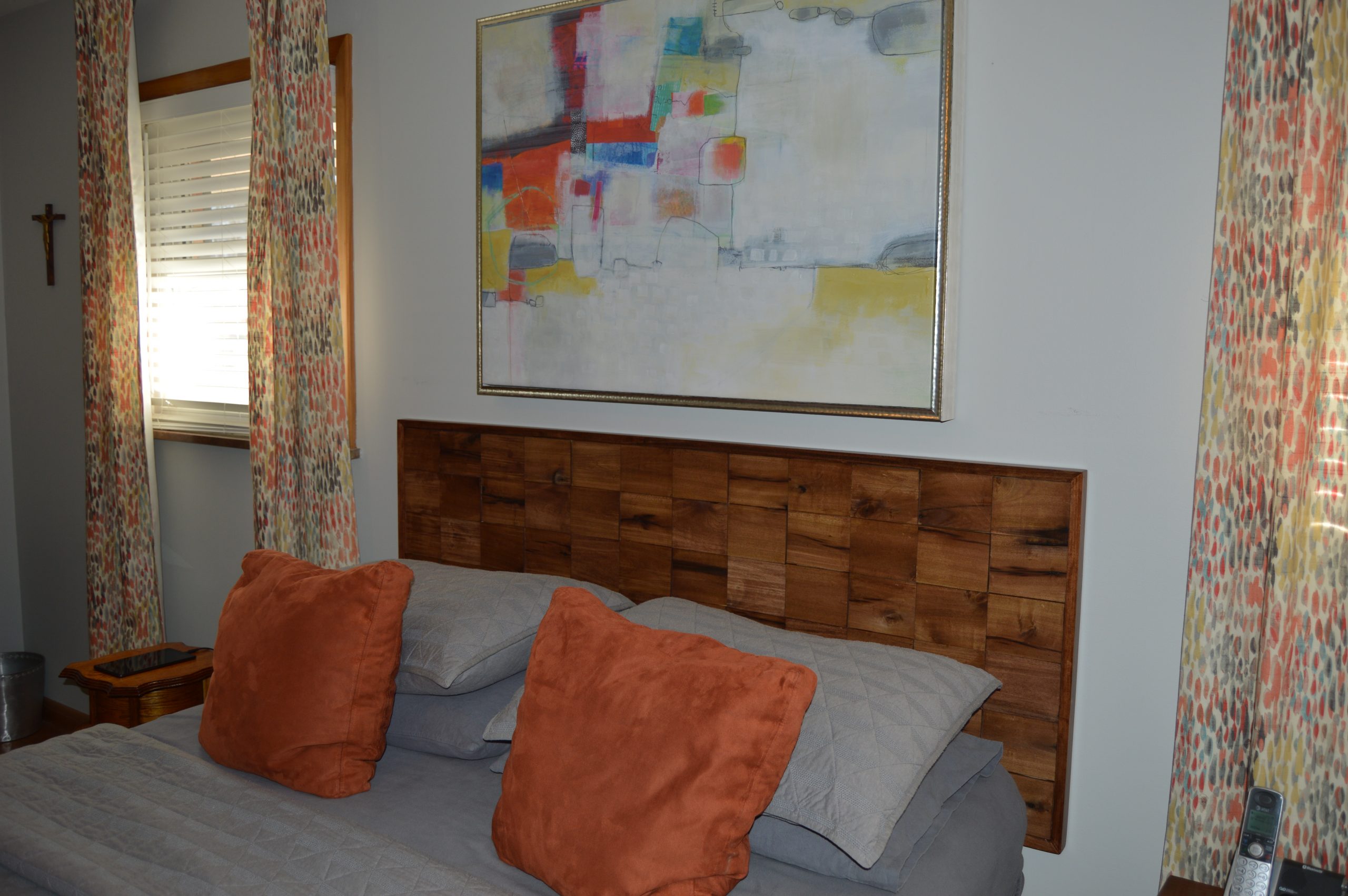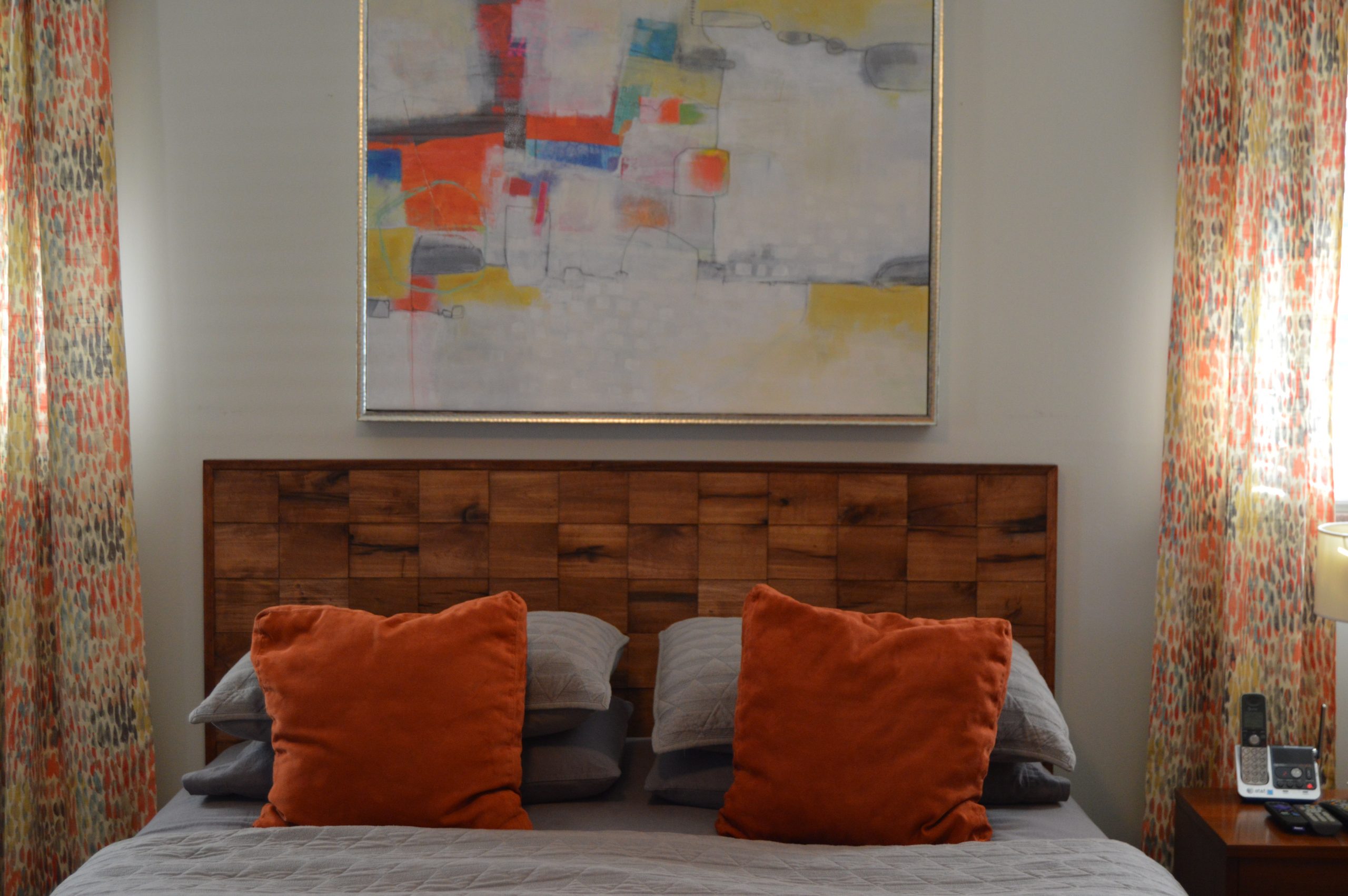 MCM headboard constructed of pine and locally sourced poplar. The background is a mosaic design of random thickness pieces of poplar and is all constructed by hand. The headboard shown is Queen size and King and Full sizes are also available.